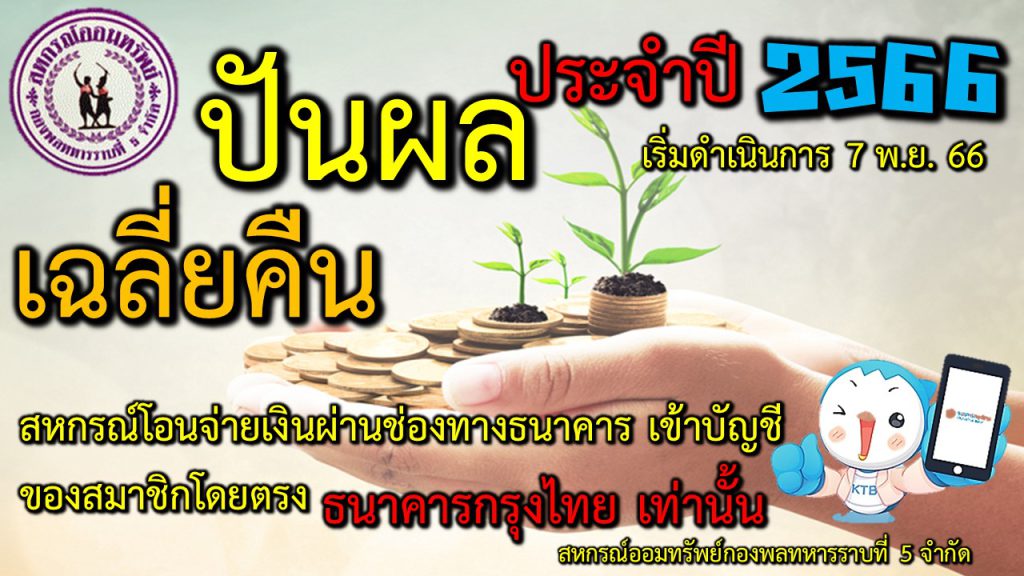 ในการรับเงิน ปันผล และ เฉลี่ยคืน ประจำปี 2566 นี้ จะดำเนินการโอนจ่ายผ่านช่องทางธนาคารกรุงไทย โดยการโอนเข้าบัญชีธนาคารของ สมาช…