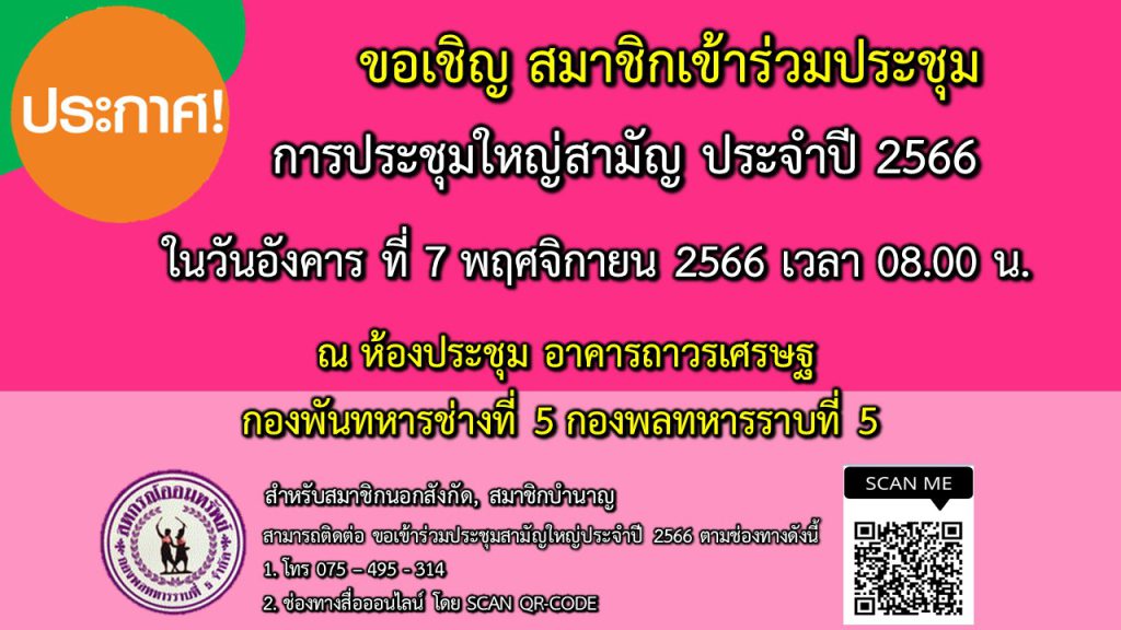 การประชุมใหญ่สามัญ ประจำปี 2565 สหกรณ์ออมทรัพย์กองพลทหารราบที่ 5 จำกัด วันพฤหัสบดี ที่ 24 พฤศจิกายน 2565ขอเชิญเข้าร่วมการประชุมใหญ่สามัญ ประจำปี 2566