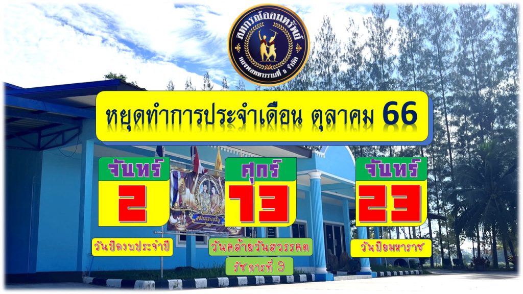 ด้วย สหกรณ์ออมทรัพย์กองพลทหารราบที่ 5 จำกัด ขอแจ้งให้ทราบวันหยุด ประจำเดือน ตุลาคม 2566 เพื่อความสะดวกในการเข้ามาติดต่อกับทาง…
