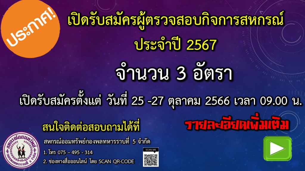 ด้วยสหกรณ์ออมทรัพย์กองพลทหารราบที่ 5 จำกัด มีความประสงค์จะรับสมัครผู้ตรวจสอบกิจการสหกรณ์ ประจำปี 2567 จำนวน 3&nbs…หยุดทำการประจำเดือน ต.ค. 66